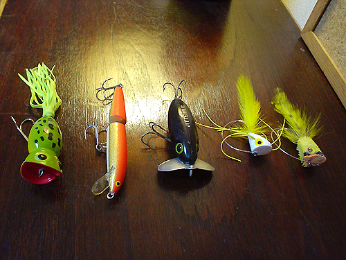 | 最近、アーボガストが気になりだして、見つけてはたまに買ったりしている。まあ、ジタバグなんてオールドでもヘドンに比べたら易いもんだし、今のうちにいいものあれば買っとくか、という感じなワケです。ちなみに写真はボクが持ってるアーボガスト社のルアーです。一番気に入ってるのは奥のフロッグカラーのフラポッパー。いい味出てるでしょ。それと手前の白いフロッグ、これはFRED’S FROGと言って、知る人ぞ知るレアアイテムです。 |