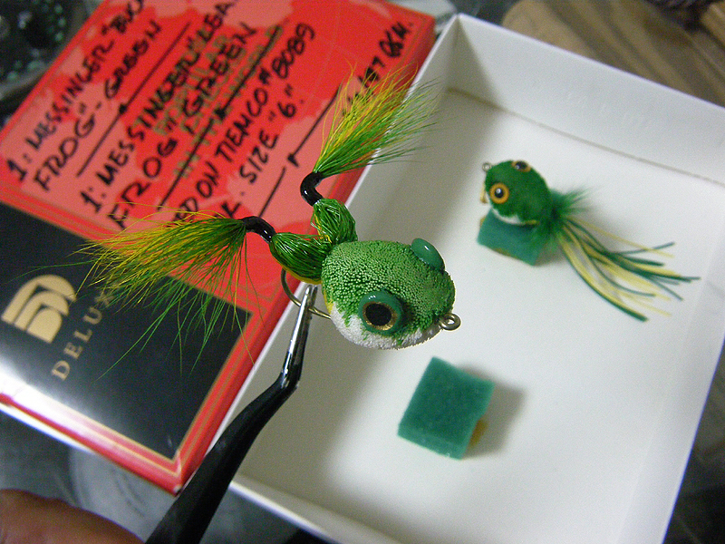 このフロッグは、1997年6月のフライフィッシングショーでマスタータイヤーとして参加していたJoe Messinger Jr.によって巻かれたものです。箱には父親のバックテイルとLEAPフロッグと呼ばれる2つのパターンが収められていて、蓋には本人が書いたと見られる説明書きとサインが書かれています。スパン・ディアヘアのパイオニアのご子息というだけあって、さすがにボディはすばらしく、これが本物!スパン・クリップド・ディア!といった感じです。ちなみにどうしたらこういう美しいクリップド・ボディができるのか?これは何度もやってみたらわかるのですが、結構重要なのが、一回一回のフレアさせるディアヘアの量。ほとんどこれで決まります。この量が少ないとスカスカになり、剃刀も立たないんですね。まあ、当たり前のことですけど......。ちなみに一回の少ない量で回数を増したらどうかというと、じつはこれもダメなんです。1回でフレアさせるヘアの量はヘアパッカーでプッシングした時、ヘアが前に押し返してくるくらいが適量のようで、それで最後までいくと、すごくいいボディができるんです。でもって密度が濃くなると、剃刀も立ち、シェイピングもジョリジョリっと、ヒゲを剃るみたいに気持ちよくできるというわけです。ちなみにそういう感じで頑張って巻いたボクのヘアバグ、何年たっても未だ勉強中と言うわけです。