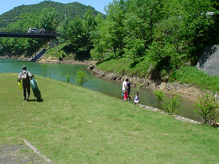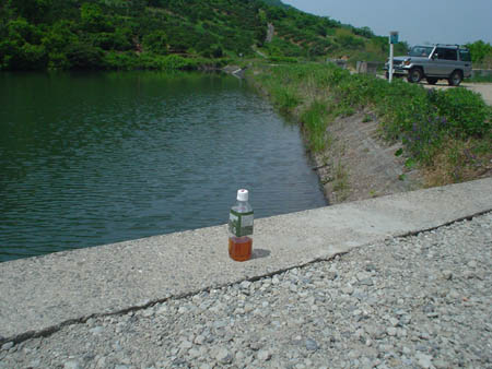 ということで釣行記に話をもとに戻しますと・・・。 ![]() 結果的には、この池は不発に終わってしまいました。 デカいバスはいるのですが、デカいバスしかいません。 つまり数がいないので、ハズレか大当たりかのどちらかなんでしょう。 しかもこの時間になって、日が差してしまうとハズレの確立が80%くらいかも。 やっぱデカバス狙うんなら、朝一の薄暗いうちからウェーダーはいて、 ちょっと東の空が明るくなってきたら、そぉーっと池の端から静かに入水して ラインも、ギャーギャー出さずに、そぉーっと出して 岸際の草スレスレにポッ!っとデカバグを落としてやらないとだめかもね。 細かい波紋が立ってすぐに消えるくらいの高浮力波紋が理想的かな。 そのあとピッピッピッ!っと波紋アクションさせて止める。 すると大抵のデカバスはパフ〜ッと吸い込むよ。 それで出なかった場合はもう終わり。 でももう一つ試してみる別の方法もあるみたいだね。 着水と同時にゴボゴボゴボゴボゴボゴボといきなりバカみたいにアクション させて止めると、ゴボン!と慌てて飲み込んじゃう場合もあるんだよね。 これもデカバスには有効。 いずれにしてもバグのサイズにはあまり関係はなく、 大きいから良いというものでもなさそうです。 大きいから浮力が高いというのがメリット。 重要なのはあくまでメリハリのある動きと波紋で、 小さなフライで止めたあと、リーダーに引っ張られて 微妙に不自然な動きをすると絶対にデカバスは釣れない。 これは本当の話・・・かもよ。 まあ少なくともボクがそう信じてる。・・・だけ。かもよ。 さて次はどこに行こうか、 しょっぱなからマニアックな池すぎたため、全員ボウズだ! 次は魚影の濃い池にしょう。 ![]() ということで次の池がここです↓ ![]() ここは結構大きな池なのでひと通り釣るのに時間もかかりそう。 案内人は岸から写真を何枚か撮って、車に戻って仮眠するのでした。 この先まだ長いし、今のうちに寝ないとずっと運転だから眠れなくなるんだよ。 事故でも起こしたらたいへんだからね。 こうして案内人は車に戻って昼寝ならぬ朝寝をきめこむのでした。 そしてしばらくして・・・・ 蒸し暑くて車中で汗だくになって起きてしまいました。 もう2時間近く経っていました。 あれ?みんなどうしたかな、湖畔に立つと、 ちょうどF氏が戻ってきました。 案内人:「どうです、釣れましたか?」 F氏:「1匹釣れました。」 案内人:(え、1っぴきだけぇ〜)っと心の中で思てしました。 一方M氏は5匹くらい釣れたと言ってました。 「ハラ減りましたね。」 うどんを食べることにしました。 ![]() いつも大繁盛の谷川製麺所 お替りをするM氏。なんと生醤油うどんにして食てました。通ですね。 ![]() 昼食後、次の釣り場へと向かう。 ![]() ここは東讃の野ダムです。半分公園のようになっていて、 キャンプをするにはよさそうですが、真昼間から釣りをするには いかにもダメそうな場所です。 子供釣れの親御さんの姿も見えます。 海でもないのに浮き輪を持つ大人を子供たちが不思議そうに見ていました。 いや、むしろ子供は笑っていて、大人が不思議そうな顔で見ていました。 ![]() 子供からフローターについて質問をうけるM氏 M氏のおすすめフライがコレ。名前は「セクシーバグ」というそうです。 ![]() 奥さんのパンストでフォームを包んだものとか。 下地が透けて見えるのがセクシーなんだそうです。 なるほどねぇ。 よく見ると確かに両端を縛られて ムチムチっとした色白のフォームがセクシーに見えた。 案内人:「コレ、バスが食ったら伝線しませんか?(笑)」 M氏:「それがいいのです。バスはパンスト破りがしたくてこのフライに出るんです」 そんな、あほな・・・・ そんな感じで、このフライを見て冗談言ってましたが、 このセクシーバグが最終的に奇跡を起こすとは、 この時点では我々は夢にも思っていなかったのでした。 ![]() ここもかなり広い釣り場なので、案内人はずっと見物してました。 結局ここは結構釣れたそうです。反応はいいのですが、やはり型が。。。 1時間くらいして、次ぎのダムへと向う。 ところが! 次のダム湖が終わってた。 ![]() なんだよコレ〜。 ここはもうダメかも。いいダム湖だったのになぁ。 でも以前にもこのダム湖はこういうふうになったことがあるんです。 だから満水になればまだイケるかも。 今回はさすがにここはパスしました。 で、さらに次の池。 ![]() ここは結構期待がかかった池だったのですが、 既にフローターが奥のポイントまで入っているのでした。 ちきしょーやられたぜ。 それでもとりあえずせっかく来たのだからと入水するふたり。 ![]() 案内人もここは大きなバスが釣れると期待してフローターで写真を担当。 でも釣れるのは小バスばかり。 さぬきうどんBASSツアーって、朝夕以外の日中はいつもこんな感じなんです。 結局そんなに釣れてないのです。底を釣るワームなら日中も結構釣れますが、 この時